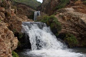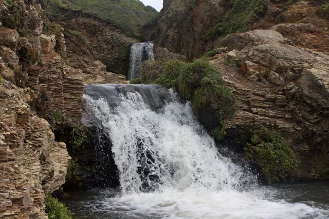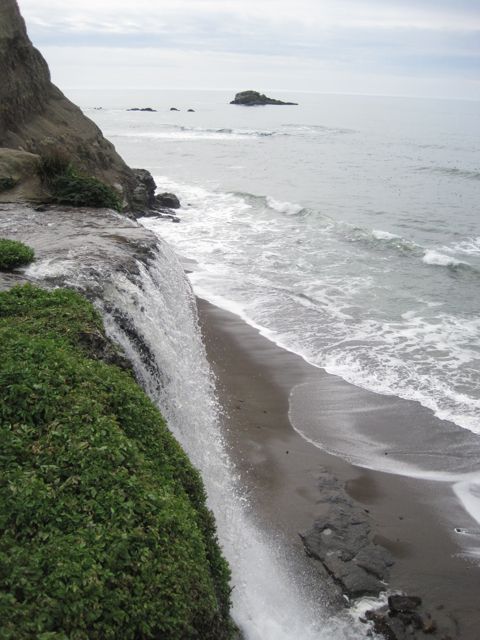 As you approach them, you’re not even sure what you’re seeing. You’re walking toward the ocean but high above it on a bluff, headed the same direction as the stream. As you get closer, you realize that the creek stair-steps down low crumbled cliffs, streams across the level surface of the bluff, and then disappears over the cliff to crash onto the beach about 50 feet below.