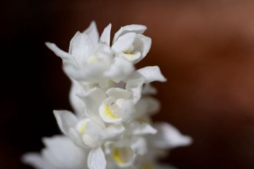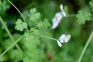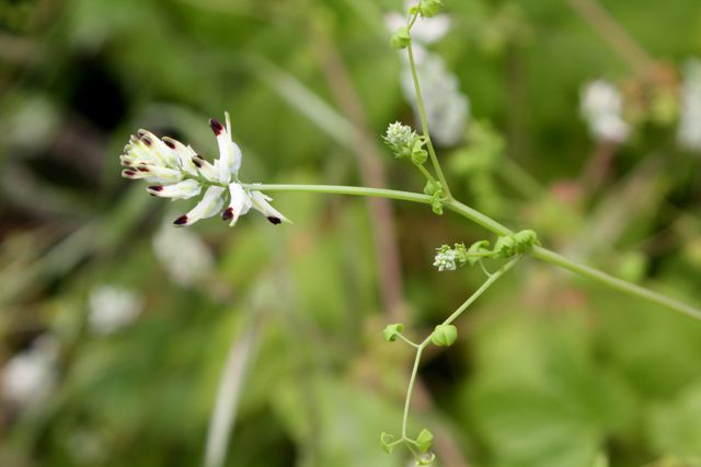 Its diminutive white blossoms are tipped with a dark brownish red, and delicate three-parted leaves are spread sparsely along twining stems. Despite somewhat pea-like flowers, fumatory is actually in the Papaveraceae family – a diverse group that also hold both poppies and bleeding hearts!