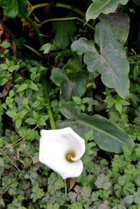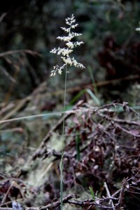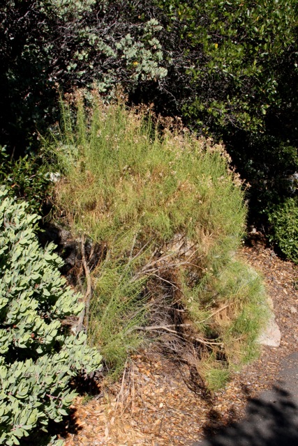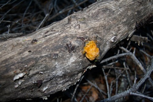 This is witch’s butter, or Tremella aurantia. It’s a parasitic fungus–but it’s actually not feeding on the wood of the log, but on another fungus (Stereum hirsutum, or false turkey tail) which in turn is feeding on the dead tan oak. The legend behind the name is that witch’s butter will grow on your gate if a witch has put a hex on you… in order to break the hex, you have to kill the fungus by poking it with pins. It is described as edible but without flavor–the kind of thing a tasteless witch might eat?