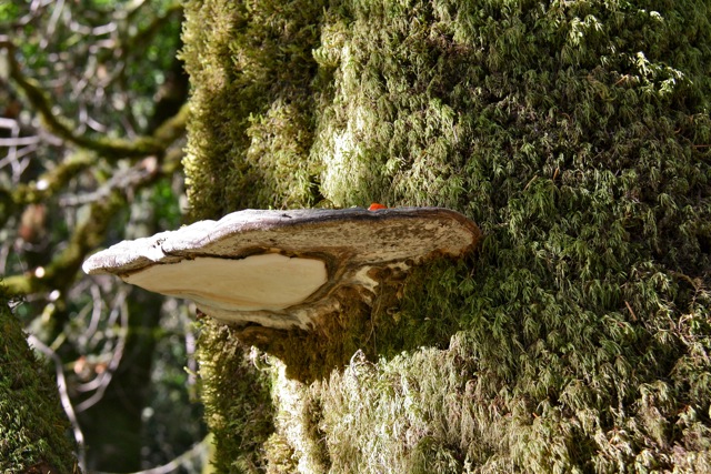 This woody fungus is in the polypore family. This group tends to be shelf-shaped and also lacks gills; instead spores are released from a minutely pored undersurface. There are a lot of different kinds of shelf fungi, but artists conks are fairly easy to identify. They grow on many different types of trees, but are particularly common on pepperwood (aka bay laurel).