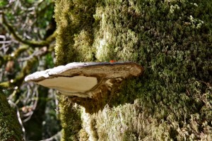A sturdy, round shelf seems to be hung from the mossy trunk of a pepperwood tree. It’s brown and woody on top, with a creamy white surface below. You could set your drink on it, if you happened to have one with you while hiking. This charismatic fungi is an artists conk (Ganoderma applanatum), earning its name because if you scratch an image into its white underbelly, the depressed area immediately turns dark brown. This ready canvas is tough to resist–but any marks made are permanent, so it’s probably best to hold back and keep graffiti out of the woods.
