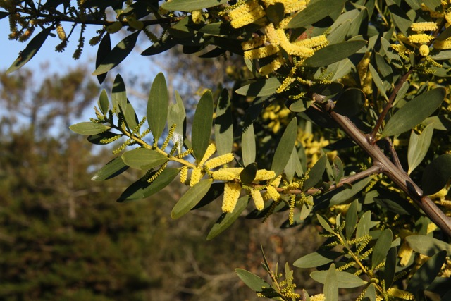 This small tree boasts little yellow bottle-brush flowers scattered among long, blade-shaped leaves. Sydney golden wattle (Acacia longifolia) is native to Australia, but has naturalized here in southern and central California. It is distinguished from many of the Acacias by having leaves that aren’t feathery or divided, and also by having long rod-shaped spikes of flowers, instead of puffy pom-pom-shaped balls.