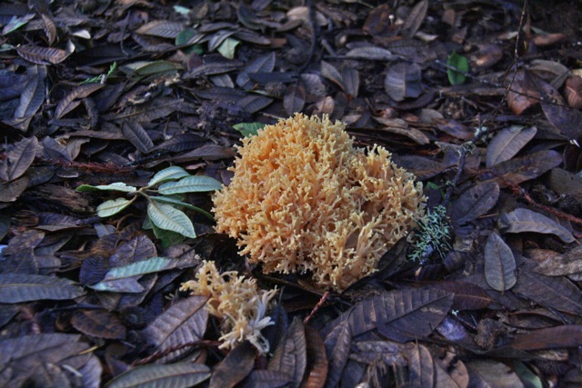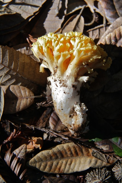Yellow coral mushroom (Ramaria rasilispora) is the most common fungus to meet this description—though there are several others. Its lower branches and “trunk” are white, don’t stain green or brown when bruised, and are solid rather than gelatinous. It’s common throughout the west, and in our area is mainly found under tanoaks or live oaks. Interestingly this preference changes with region and elsewhere it is most often found beneath conifers, according to my field guide.