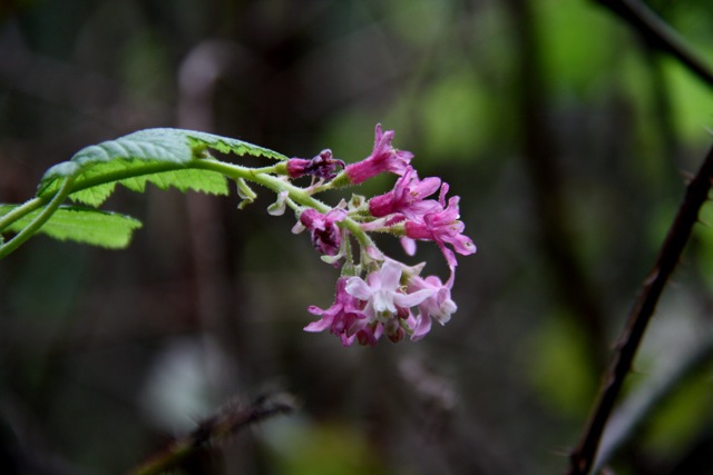 Pink cascades of flowers dangle from the nearly-bare branches of a tall shrub. This is red flowering currant, or Ribes sanguineum, an early bloomer that usually blossoms from January on throughout the spring. Up to 20 small flowers unfurl from each raceme, varying shades of pink near the end of each branch where last year’s brown twig has given rise to a new shoot of green.