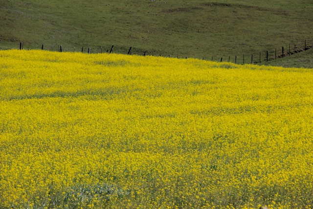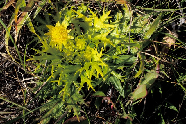 Small yellow flowers spring up from a patch of strawberry-like leaves. Each bloom has five rounded petals, widely spaced around a central mound of many stamens. This is mock strawberry, or Duchesnea indica. It is native to India, and is now found scattered occasionally throughout Marin and a few other parts of California where it has escaped from garden cultivation.