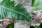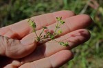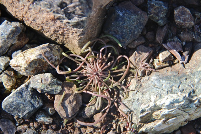 An art-deco spire of flame colored flowers rises from a mound of leaves beside the trail. Each flower is dramatically flattened, hooded and flared. This is African cornflag, or Chasmanthe floribunda, an escapee of ornamental garden plantings. It’s not a common sight in the wild, but it is established in patches, usually on the edges of residential areas, so that it could be mistaken for a native.