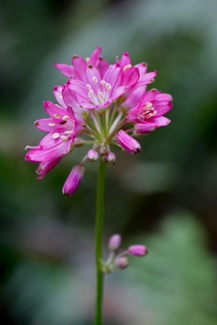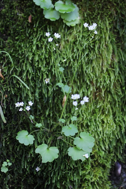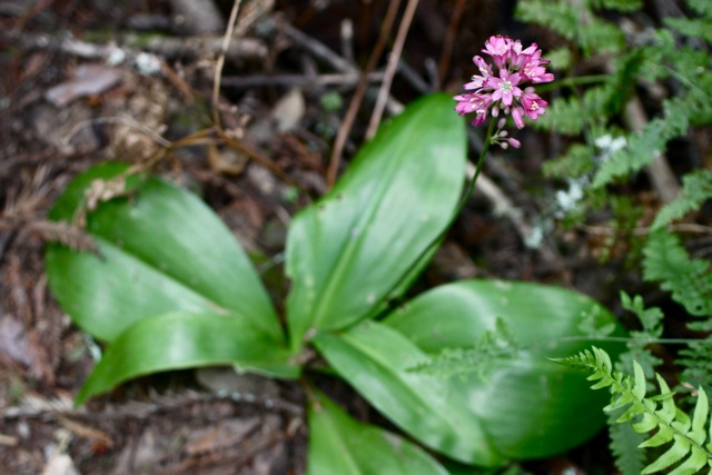 Red clintonia (Clintonia andrewsiana, also known as Andrew’s clintonia or blue-bead lily) generally grows under redwoods. Its range is restricted to the coast of Northern California, extending slightly into Oregon. Its berries are pretty but probably toxic–definitely don’t eat ’em.