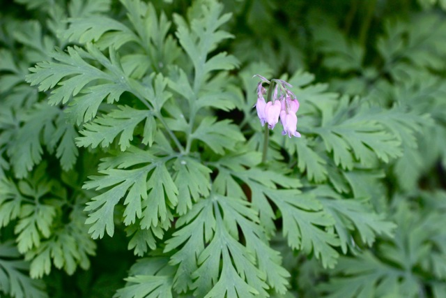 Pale pink, heart-shaped flowers are displayed above a feathery green mound of leaves. This is Pacific bleeding hearts (Dicentra formosa): one of the most distinctive blooms around. The flowers truly do resemble hearts–the upcurved shoulders look like valentines’ hearts, while a tracery of pink veins calls to mind the anatomical reference as well.