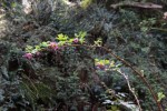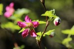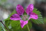 Flamboyant pink blossoms decorate the berry canes growing alongside a shady creek. This is salmonberry–a plant graced with both tasty fruit and beautiful flowers. The open-faced blooms have five delicately crinkled petals surrounding a pale cluster of stamens and pistils.
