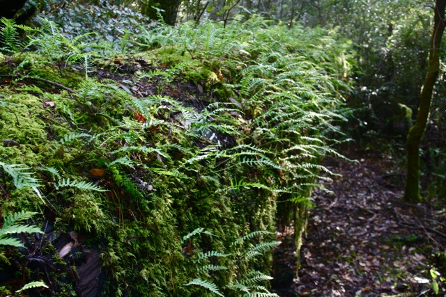 Tall, delicate sprays of tiny white flowers bloom from a shaded crevice of rock. Large scalloped leaves grow abundantly around the base of each stem. This is alum root (Heuchera micrantha), a member of the saxifrage family that was used for a wide variety of medicines by native Californians.
