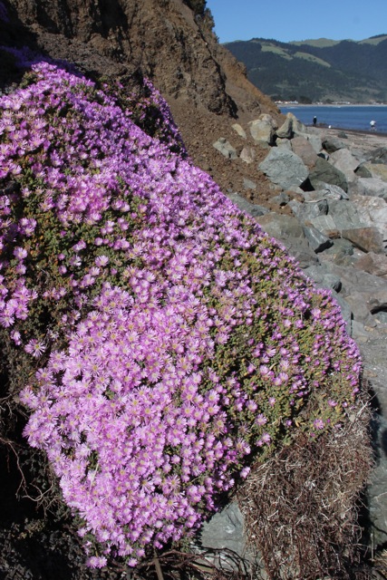 A blanket of color is draped across a bare cliff face above the beach. Gray-green succulent leaves–shaped like tiny sausages–form a dense mat that in turn is covered with bright pink flowers. Though the blooms look like daisies at first glance, they are actually in a totally different family (the yellow centers really are many stamens, not individual flowers). This is rosy iceplant or Drosanthemum floribundum.
