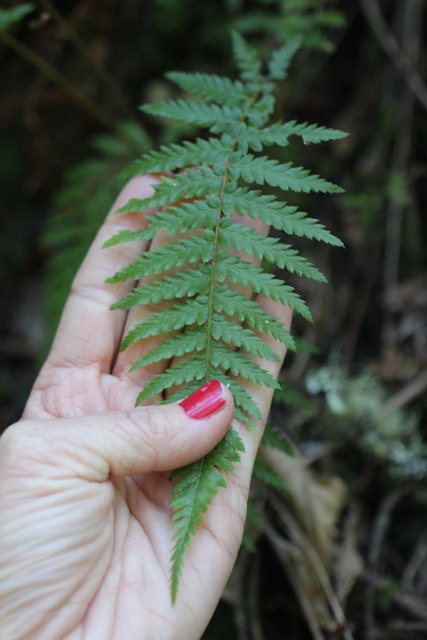 This elusive little fern is a rare sight in this area, unlike its common cousin, western sword fern. I’ve been looking for it for a while and was delighted to spot it recently, growing in a canyon among many other species of ferns.