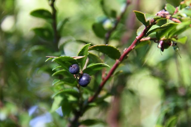 Small bell-shaped flowers of pinkish white appear at the tips of the stems in the early summer, and by now the dark purple fruit has ripened. Each berry is lightly hairy, and they are fairly sparse on the plant. Though edible, I have found them to be bland the few times I’ve tasted them. The leaves can be made into “a pleasant tea“, and poultices made of the leaves were traditionally applied to cuts, burns and sores. The fruit or leaves were also used to make dyes (of purple or yellow).